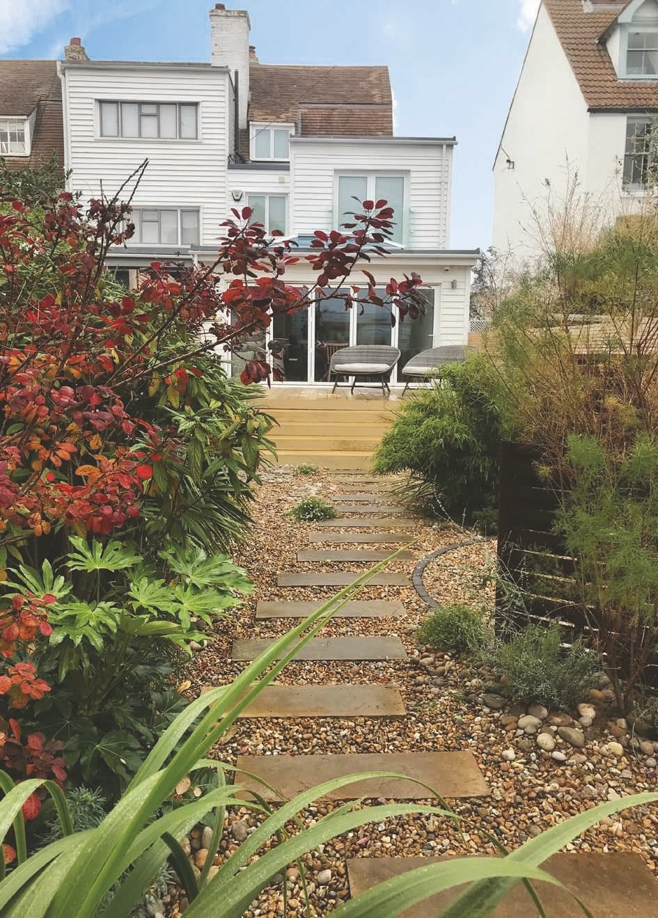 Lawns are not generally a great idea if low-maintenance is high on the wish-list, as during the warmer months they need mowing every week or two, so alternatives should be considered. Being close to the sea, shingle can create a suitable beach-style ambience and fits into the surrounding landscape. This idea of context within the wider environment and the style of the house is very important. If done correctly, the garden and house should look like they fit with each other and into the location they inhabit.