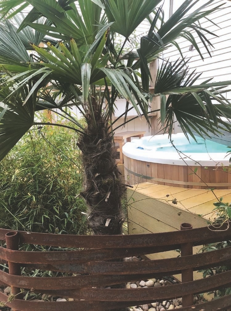 The houses in this area are mostly very old shiplap cottages built in terraces so the back gardens can be overlooked, making privacy hard to achieve. Tall trees, including Magnolia grandiflora, Olea Europa and Chamaerops humilis were planted, along with bamboo to screen off areas within the garden for sunbathing, socialising and relaxing. Planting has a year-round tropical feel with the huge, lush leaves of Cardoon contrasting with shiny needle-leaved Yuccas and Phormiums.