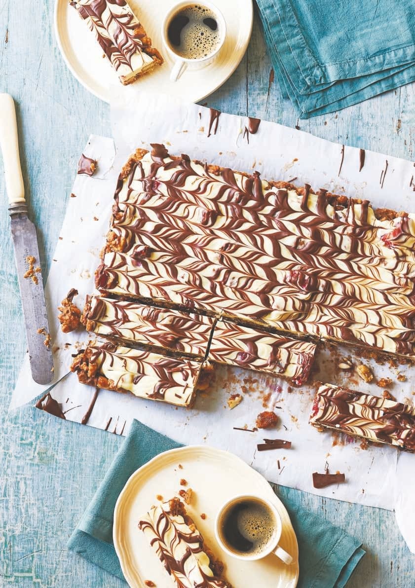 Pour the milk chocolate over the white chocolate in thin lines. Use a cocktail stick/toothpick to drag the milk chocolate over the surface to form patterns. Return to the refrigerator for at least an hour, before removing and portioning with a hot knife.