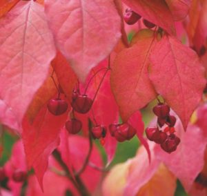 Euonymus varieties offer both foliage in brilliant shades of red, and hanging lobed fruits to the autumn garden, and do well in a range of conditions in most soils in sun to part shade. Grow as a specimen shrub, in mixed borders, in a semi-woodland setting, or massed as an informal hedge. One of the advantages of growing Euonymus is that they are tough plants which will tolerate less than ideal conditions, making them suitable for growing in a diffi cult area of the garden.