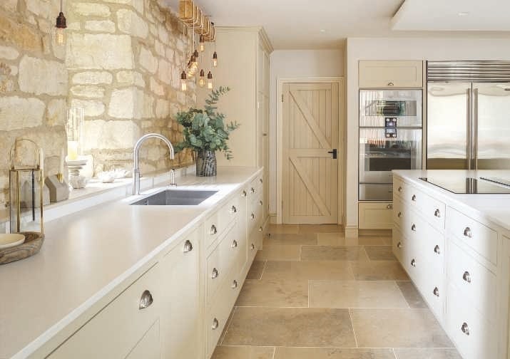 Think clean, large porcelain tiles leading from your conservatory onto your patio; the fresh, smooth, modern visuals juxtaposing the dark timber and low ceilings.