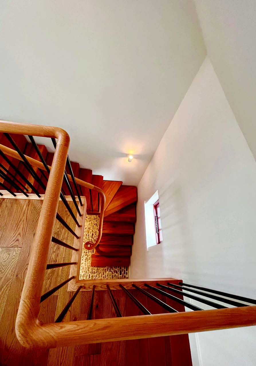 Having consolidated the old building by ensuring all that could be done to make it structurally sound again, A T Palmer’s team began the painstaking work of carrying out the detailed plans for the interior, which entailed fully insulating, plastering and decorating. Their skilled joiners fitted beautiful, new woodwork and engineered oak flooring throughout, including an impressive feature staircase, this is a masterpiece with solid iroko hardwood open treads which cantilever out from a steel stringer which is hidden from view by being boxed into the wall. The treads also sit on supporting structural steels that are notched into the treads. Matte black powder coated steel spindles and structural bars echo the existing ironmongery throughout the Carriage House.