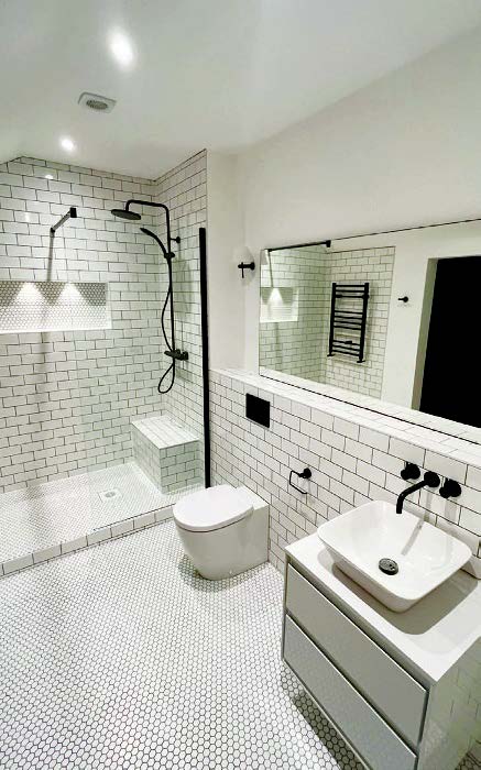 The pièce de résistance is a graceful undulating, elliptical bespoke oak handrail. The kitchenette and shower room have been finished with equal attention to detail, with a black and white theme as requested by the client. The black ironmongery is continued in the shower room which is also reflected in the choice of colour for the sanitary ware fixtures, with white units, and in the shower room there are white tiles throughout; hexagonal mosaics on the floor, with metro tiles on the walls, the shower niche, with wall lighting illuminating the mirror area. The overall effect is smart, chic, minimal and luxurious monochrome elegance.