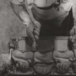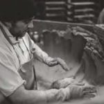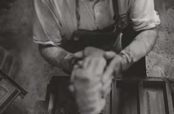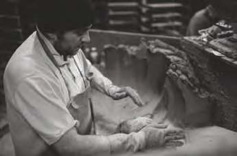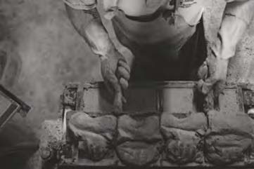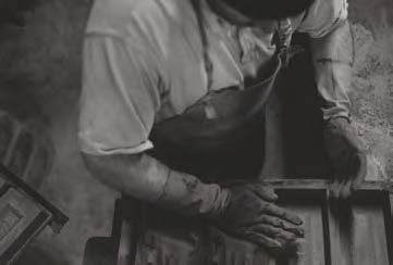 A clot of sanded clay is thrown into a wooden mould, the excess being removed by a wooden strike; it is this throwing action which compresses folds of sand into the brick which appear as veins in its surface after firing. The wet bricks are turned out onto a board for drying on stillages; between April and October the bricks are dried in the open air and, in the cold months, in heated drying sheds. These ‘green’ bricks are then stacked meticulously in the kiln, by hand, before the kiln end is sealed over and the fires lit. The fires are stoked constantly for 72 hours, day and night.