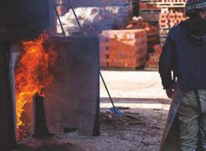 The colour gradient varies from salmon for under-burnt bricks, through orangey red to deep red, then brown. In addition, the smoke from the fires leaves its own grey blue signature and, at the highest temperatures, around the fire tunnels, this smoke residue fuses with the sand to vitrify and glaze the brick surface.