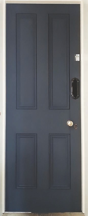 He spotted the dark grey Victorian four-panel, pictured here, in a front garden. It was painted sky blue and the owners were happy to have it removed. Now fully restored and fitted properly with vintage restored door furniture: brass knobs, black glazed ceramic fingerplate and the chrome indicator bolt, it is now a perfect bathroom door. The effect is superb.