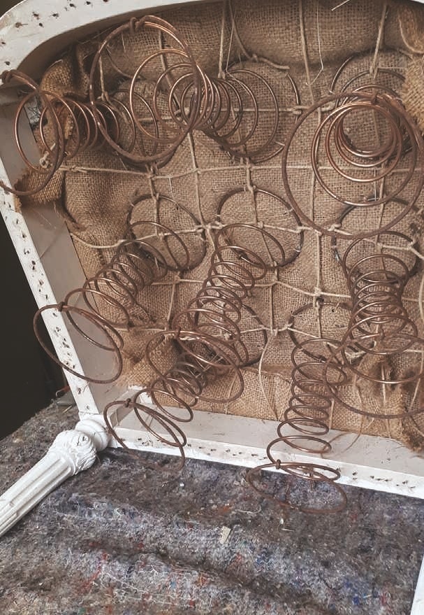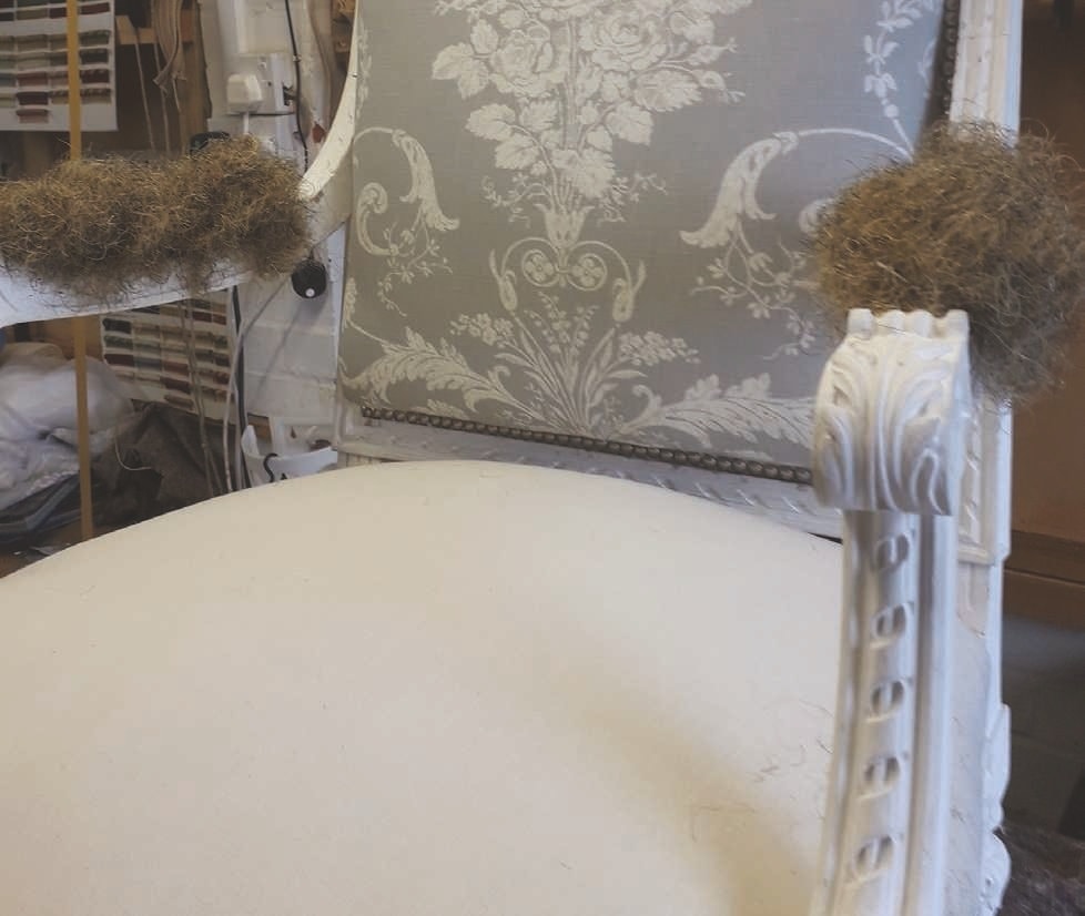 Keith works on modern furniture as well as the antique pieces where he uses horsehair and hogshair stuffing. A current project is a Regency chair, which needs work which needs new double-cone springs and new hessian. This requires the use of tacks to be authentic rather than modern staples.