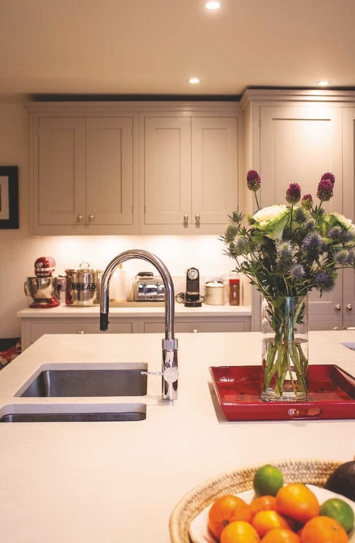 In the 17th century core of the house the open-plan kitchen and breakfast room is modern, light and airy, with a clever use of bench seating on the side of the island and breakfast bar that makes a handy additional dining area.