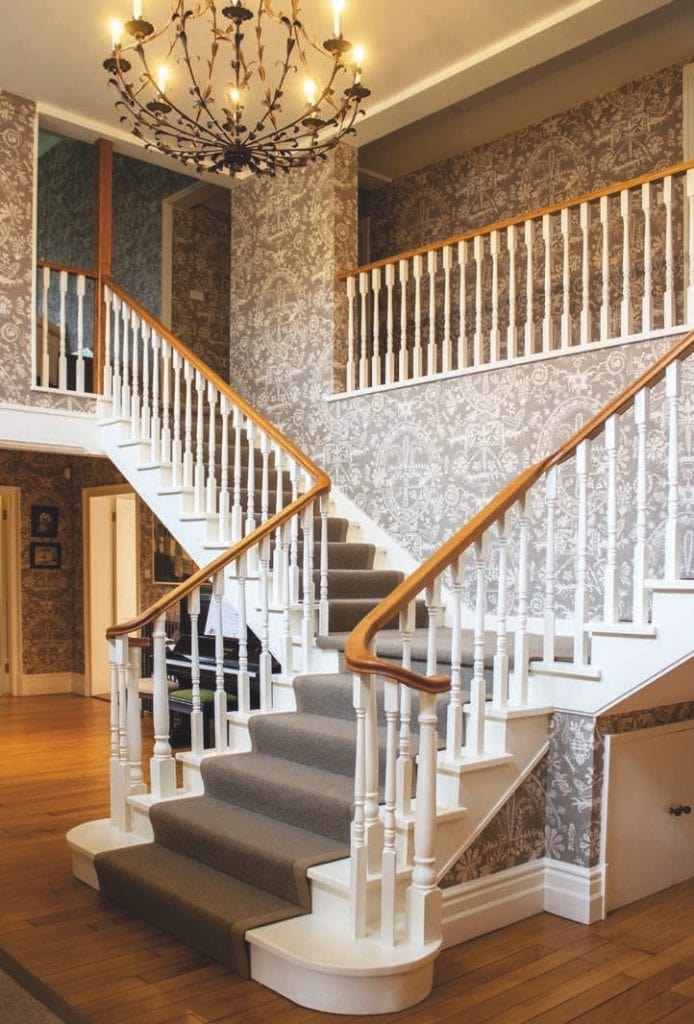 The wall at the back of the staircase has been opened up along nearly its full length, creating a gallery effect to the upper landing on the other side of the wall, giving a view through and allowing light to flood the area, creating a feeling of space and grandeur. Matching spindles on the bannisters and the gallery balustrade establish continuity, as does the custom hand-printed wallpaper chosen by the client, who has led the interior design on the refurbishment with bold and inspired ideas to suit their taste and lifestyle.