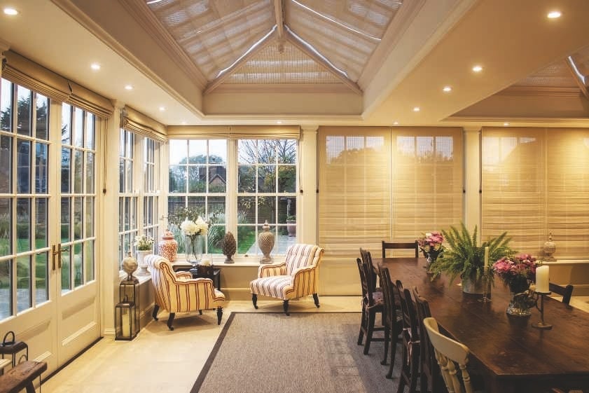 An old extension has been demolished, redesigned and rebuilt to create a superb new dining room extension and orangery. This isn’t a traditional orangery where the glazed walls would stay firmly in situ: it has been given a much more modern and flexible feel with large glazed double doors allowing access to the landscaped gardens, terraces and the swimming pool, giving the all-important ‘inside-outside’ feel.