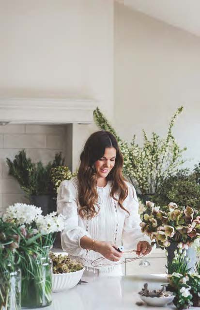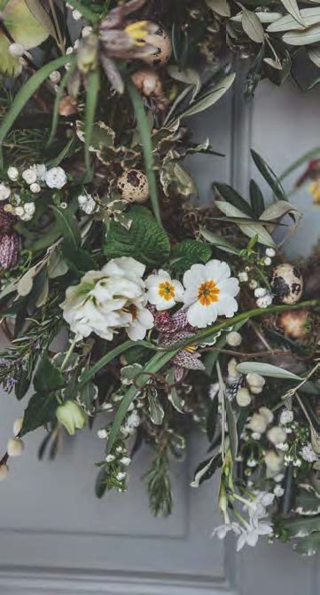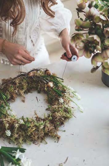 - Once all of the flowers, bulbs and plants are secure, fill any gaps with the foliage. Cut the foliage down to lengths of around 15–20cm (6–8in) and insert the stems directly into the wreath base at a slight angle.
