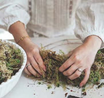 - Add a chunky layer of sphagnum moss to the wreath base and secure it by taking the wire over and under the frame the whole way around. Keep the wire attached to the wreath.