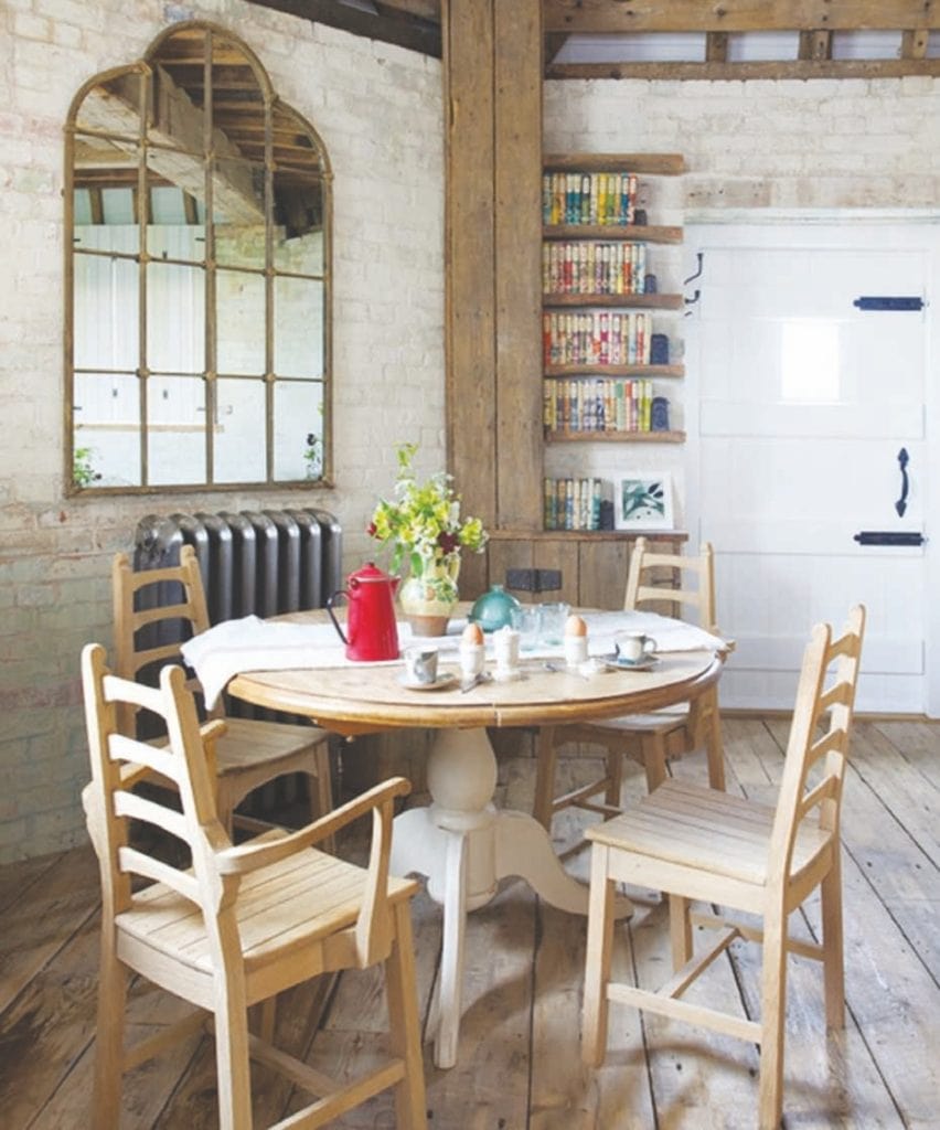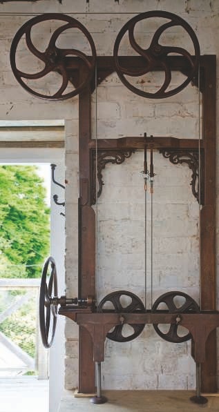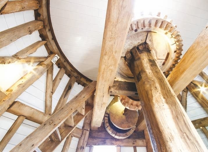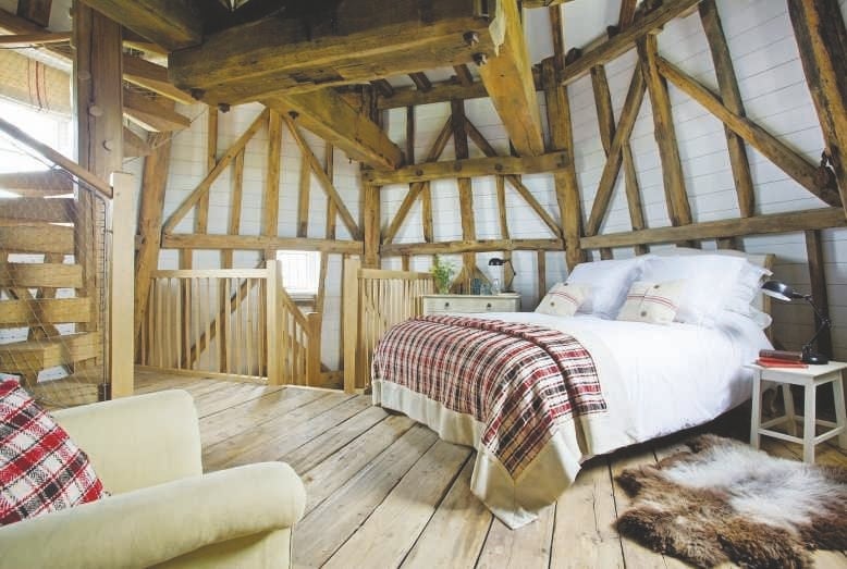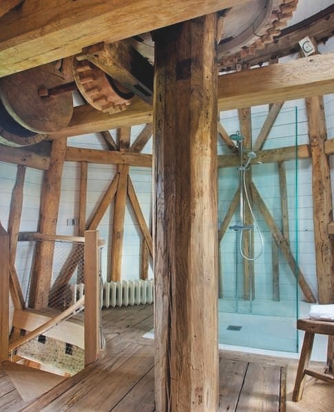 Nestled among this wooden kingdom is one bedroom and one bathroom, complete with a free-standing bath. There are also quaint reminders of its industrial past, with massive preserved wooden beams spanning each floor carrying the original giant spur wheel and sack hoist.