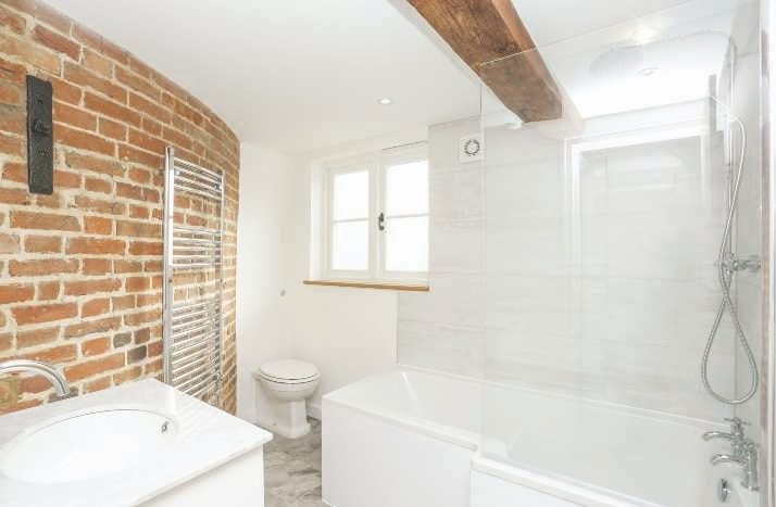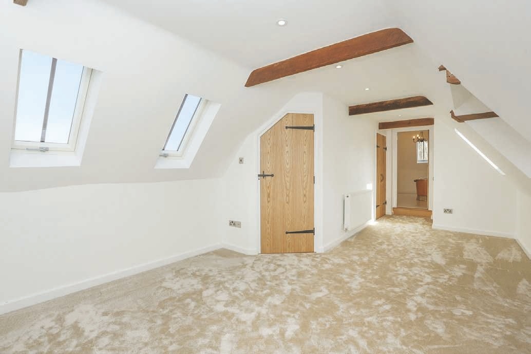 Another solid oak staircase leads to the top floor that contains even more luxurious accommodation, the master suite consisting of an expansive bedroom with sloping ceilings and more beams, and another of the original features that has been preserved just outside the bedroom’s window. The lucum that is attached to the roof, which was used to hoist fresh hops up to the loading doors of the drying floor is still very much in evidence, as are the doors themselves, which have been preserved and pinned back on the exterior.