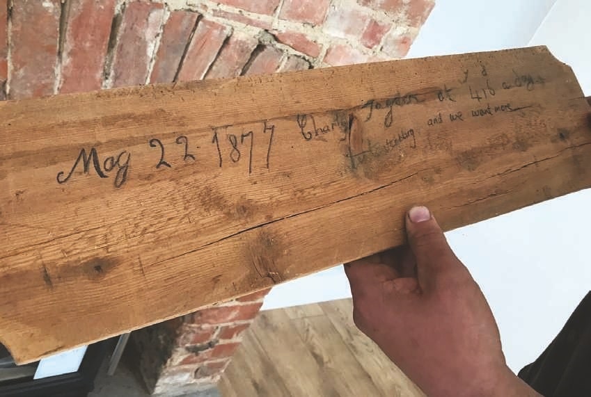 Meeting Julian again and seeing the great work he has done on this building I am reminded of how I was impressed with his obvious enthusiasm and passion for the uniqueness of buildings and their history. He commented previously on how he often muses on whom the craftsmen were that built and worked on them hundreds of years ago, and how this brings the past to life for him. And this time he has a tale to tell of discovering a plank of wood he found whilst working on the neighboring property, this is the housekeeper’s house that was built by the same people as Cherville oast. One of the workmen had dated and inscribed the plank, it reads, ‘May 22, 1877 Charles Taylor at 4 shillings 6 pence a day test__ing(?) and we want more’. We’re not quite sure what one of the words is but the message from the past is loud and clear about the dissatisfaction with the day rate! It’s a perfect reminder of the people that built these properties and brings the past to life.