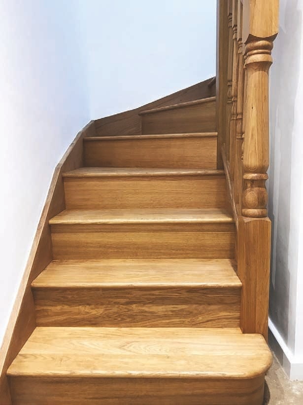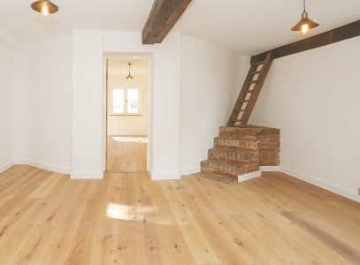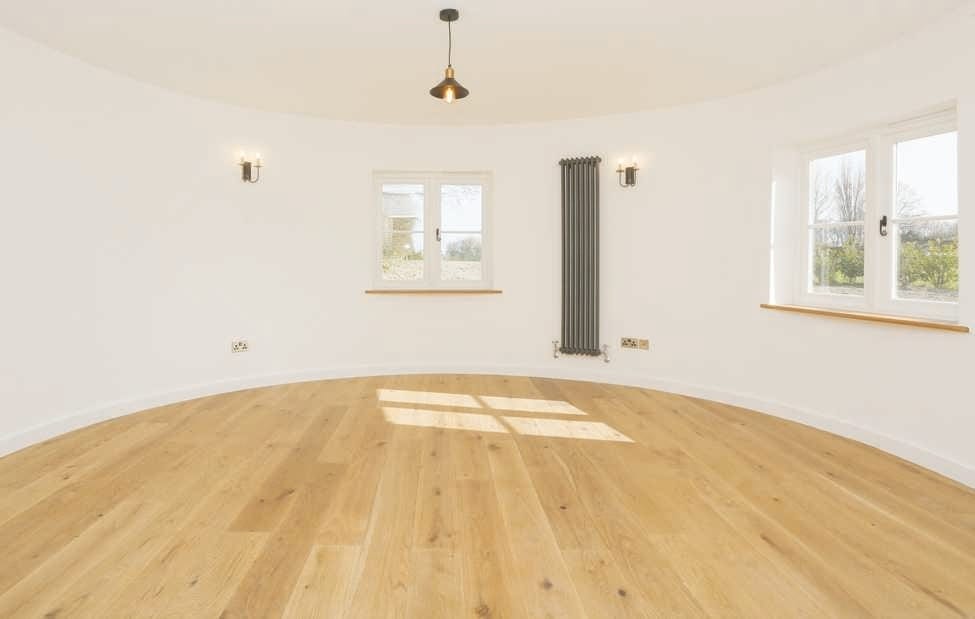 Julian’s renovation of the building has been carried out with his usual attention to detail with high-end finishes and luxurious installations, as you can see from the photos of the tuxedo kitchen with its beautifully crafted bespoke cabinetry, masterful touches including copper handles and tap fittings on the butler’s sink, and the solid warm wood surfaces. The ground floor entrance leads into a lobby with a utility area off to the side. Past the spacious kitchen you access the dining room with a beautifully preserved set of brickwork and wooden steps that originally led from the ground floor to the plenum or drying area. This unique feature has been retained as part of the Listed Building stipulations, you can see from the ‘before’ photo Julian took how this looked previously and the transformation he has achieved. Solid oak floors have been installed throughout the dining room and the magnificent circular living room that is the ground floor of the roundel.