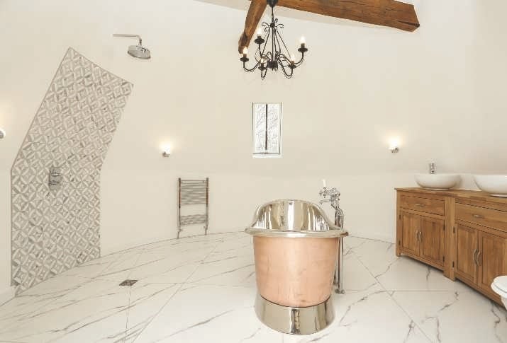 The pièce de résistance of the master suite is yet to come, the whole of the top floor of the roundel has been devoted to a lavish circular bathroom accessed from the master bedroom. This luxurious yet minimally styled room has marbled porcelain floor tiles, a vaulted ceiling with two huge original oak cross beams that are exposed to reveal their age and character, with a tasteful simple chandelier suspended from the central point. Strategically positioned in the centre of the room is the crowning glory, a beautiful freestanding, doubled-ended copper bathtub with a shiny nickel interior. It is a bathroom to die for.