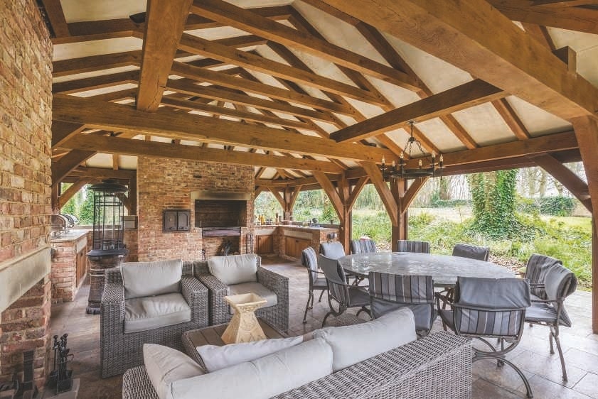 Another impressive addition is the external kitchen and entertainment area. This slate roofed, oak framed building nestles in the woodland surrounding Oxney Court. The new building has a number of solid fuel ovens connecting to a chimney with a second chimney serving a fireplace. Electric shutters protect the building when not in use and control the environment when the fires are burning.