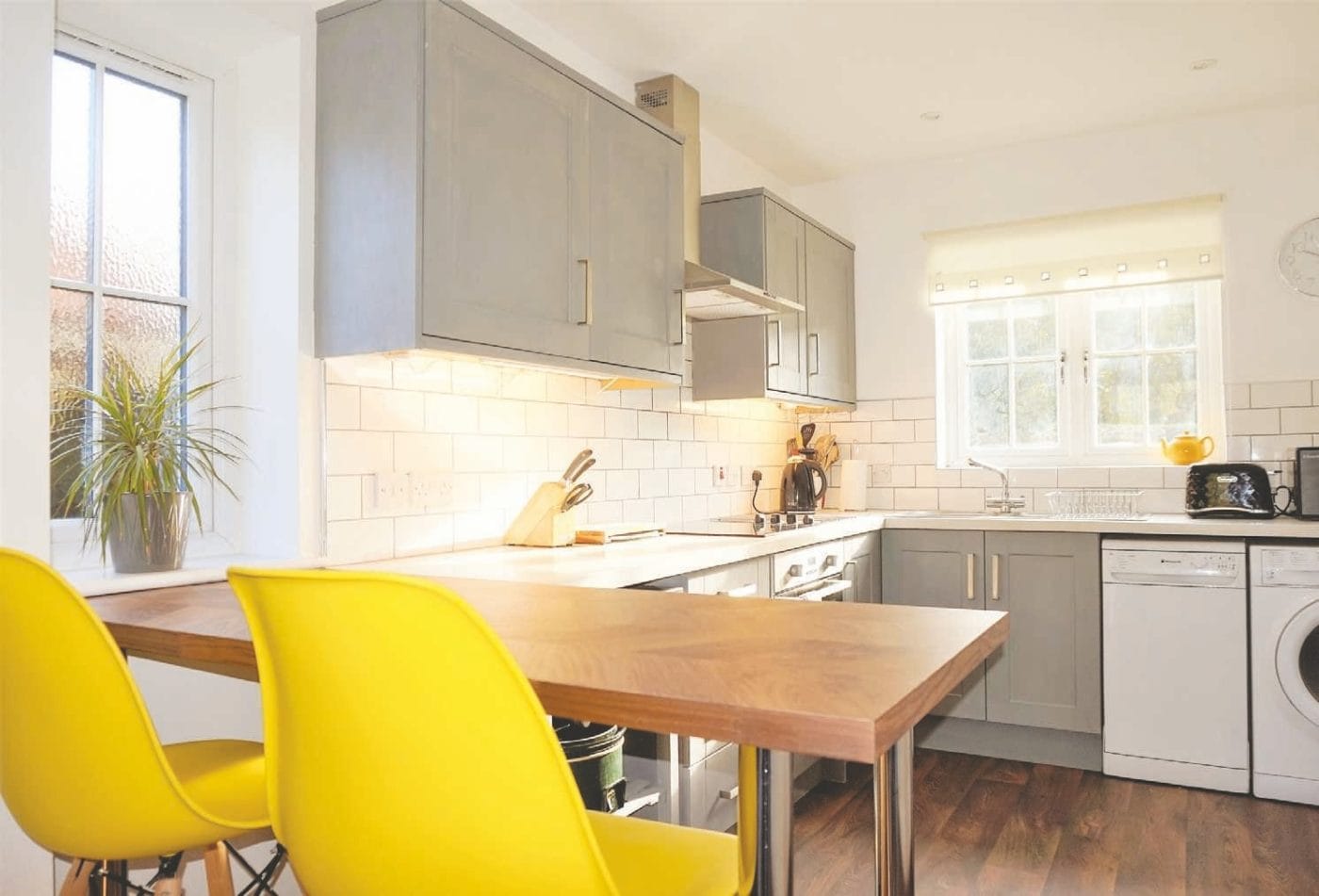 The existing kitchen was in good condition, but the colours needed uplifting; rather than having a new kitchen fitted, we proposed to paint the existing units using a rich grey which would work well with the existing light worktop. The flat white metro tiles that we had left from the shower room were used to create a new backsplash with contrasting grey grout, to bring out the rich tones of the kitchen.