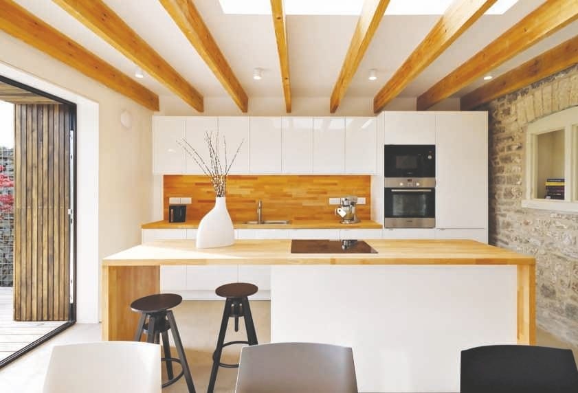 Don’t rule out mixing two materials – a marble slab with wooden worktops, say, or a stainless steel island with a wooden breakfast bar attached. Different materials can serve different culinary purposes, and can also be used to visually order your kitchen.
