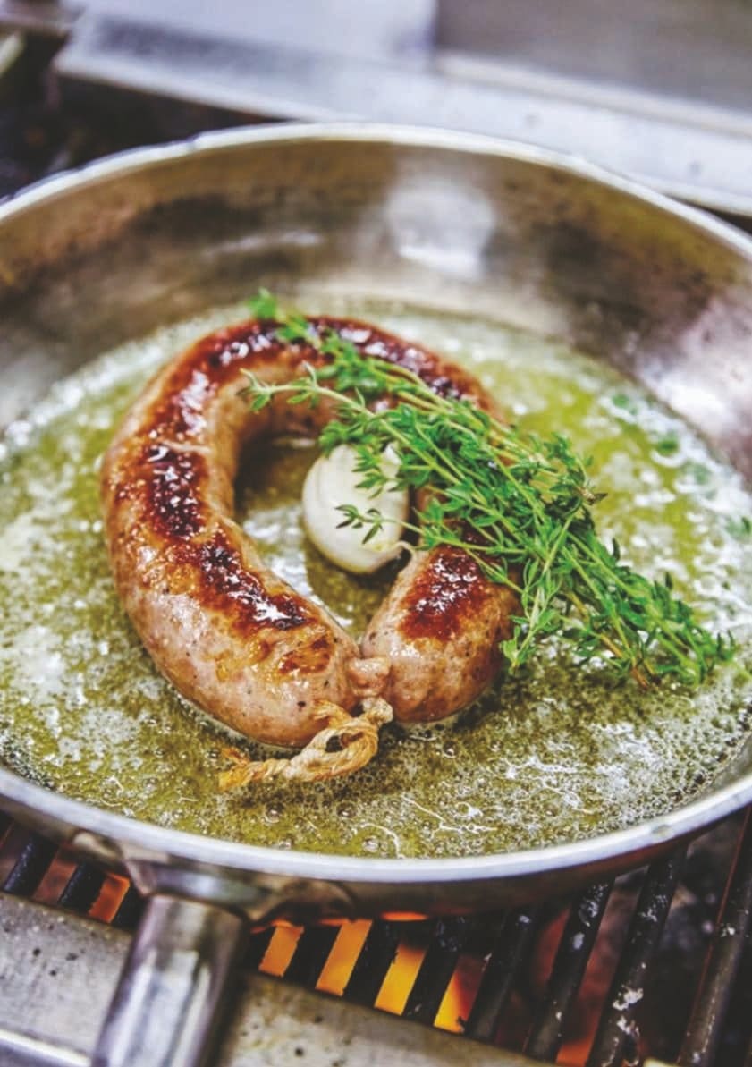 Mince again. Tie one end of a long sausage casing with string, then insert the narrow part of a wide-necked funnel in the other end. Using the back of a wooden spoon, push the meat through the funnel into the skin. Once it’s full, remove the funnel and tie the end with string. Pinch and twist into 4 individual sausages, then link and tie with string (each sausage should weigh about 200g).