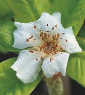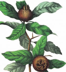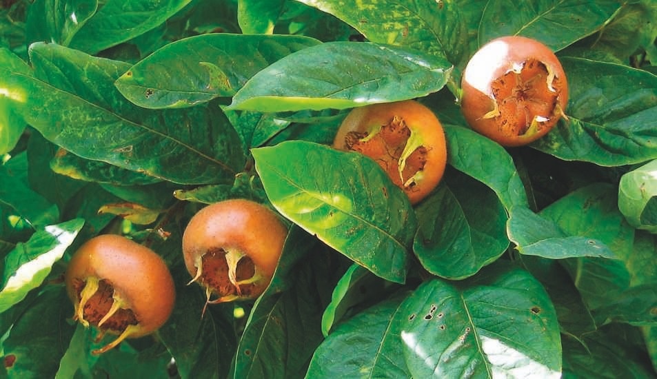 The medlar makes a handsome tree and bears odd but highly prized fruits that are only edible once ‘bletted’ or almost rotten.