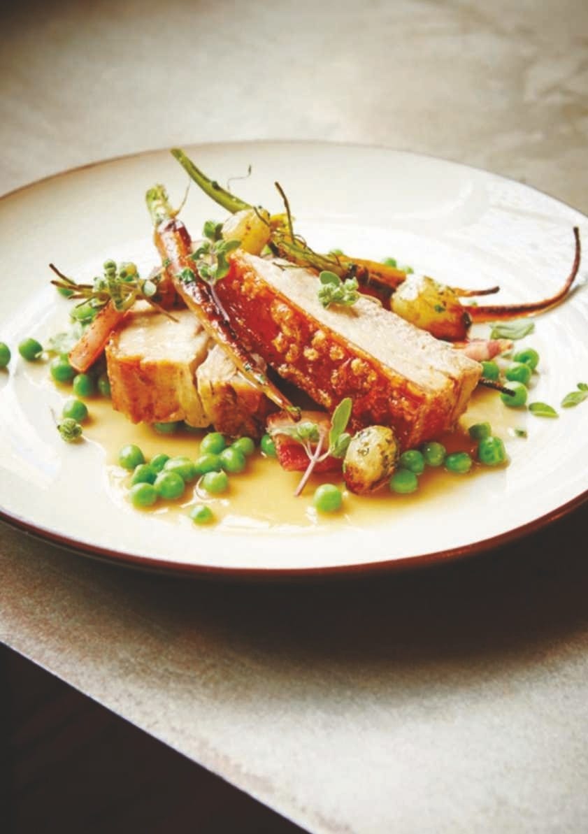 Slow-roasted Pork Belly with Bacon, Marjoram, Pearl Onions and Peas
