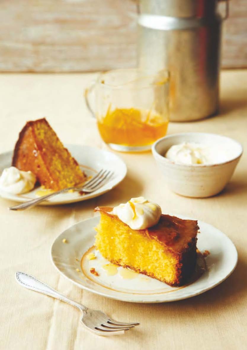 Remove the cake from the oven and place it on a rimmed baking sheet. While warm, pierce the top of the cake all over with a skewer. Pour over the orange syrup, then cover the cake and set it aside to cool and soak up the syrup, a few hours or overnight.