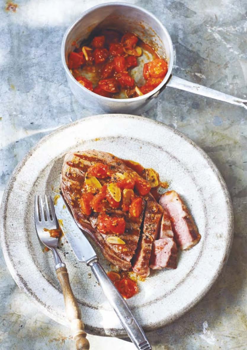 Serve the grilled steaks with the warm cherry tomato and anchovy sauce.