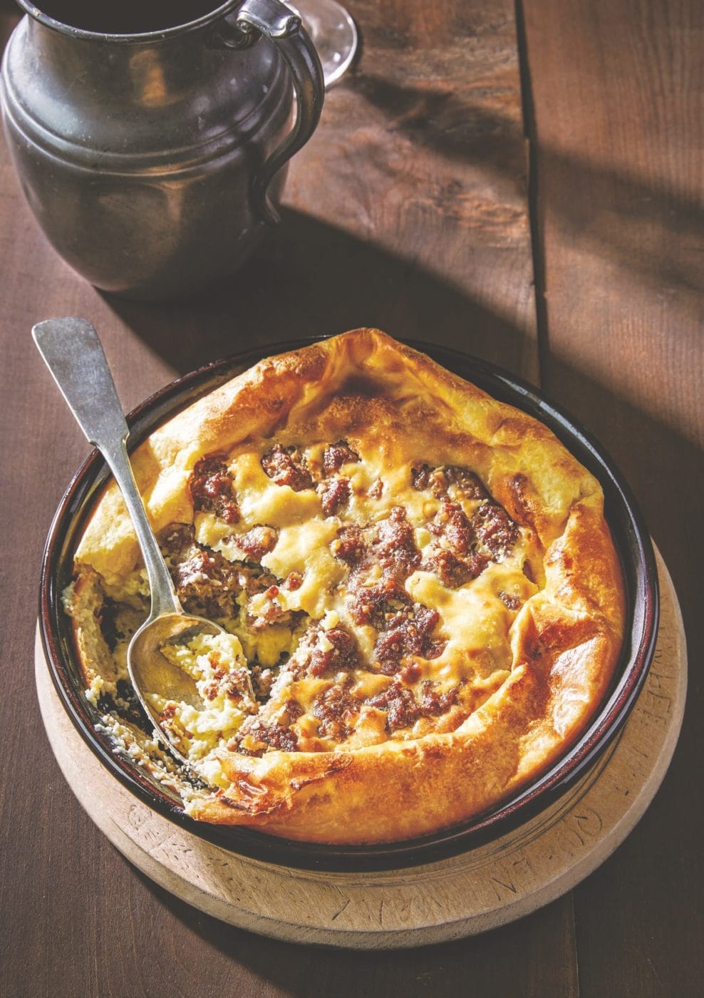 The servants’ hall table at Downton is usually laden with batter puddings, potatoes, stews, and vegetables that are cheap and filling. Toad-in-the-hole was typical of servants’ fare in the early twentieth century, as it was cheap, easy, and versatile. The name dates back to the eighteenth century, though it’s unclear why the meat was called a toad – possibly because it peeps from the batter like a toad from its burrow.