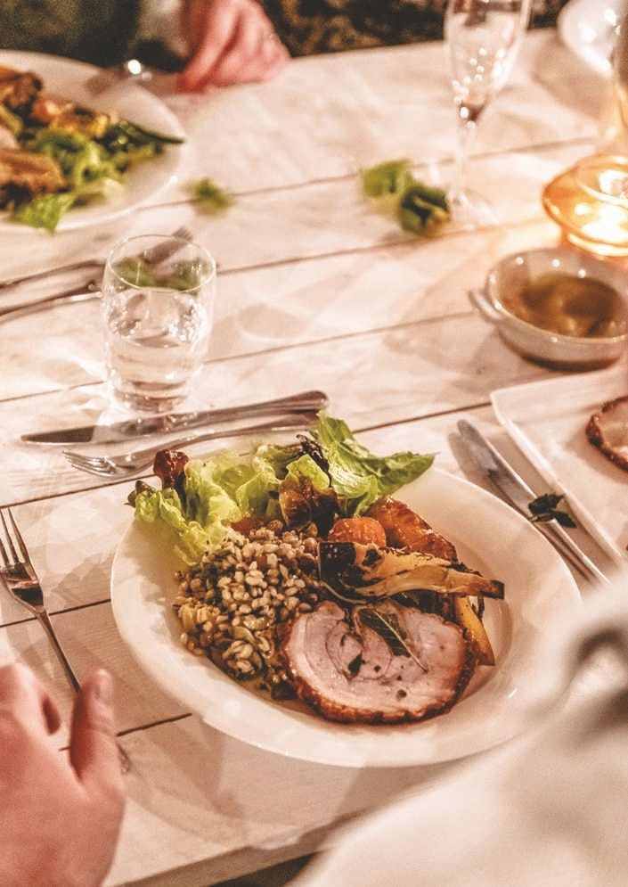 The latest Supper Club was held in Sissinghust, at Crossways, a beautiful Victorian orchard house that was built in 1894. The venue had formerly been a pig farm which naturally lent itself to the chefs incorporating pork into the menu. As the event was held in the autumn, the chefs wanted to use produce from their allotment, and in what turned out to be a happy accident, they tried a perfect planting trio of pumpkins, sweetcorn and climbing beans from which they created their delicious ‘Three Sisters’ salad’ which has become a staple part of their seasonal autumnal menus.