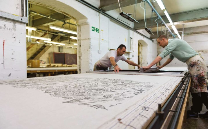 Once pattern repeats are worked out, colour separations are traced off by hand from the original design onto draft film, using pen and ink. When the full-width films are completed, they are used to engrave the design onto the ‘silk’ screen, via a basic photographic process.