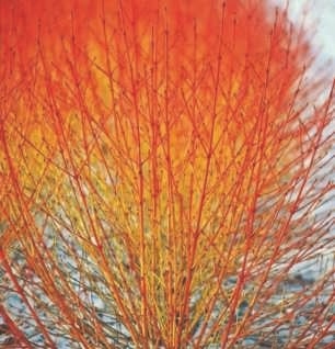 The native dogwood, Cornus sanguinea, has rich brown stems and purple, almost chocolate, autumn leaves but is seldom planted in gardens. The cultivated variety of the common dogwood, Cornus sanguinea ‘Winter Beauty’ or ‘Winter Flame’, has rich orange stems and wonderful deep purple autumn leaves. Much the best-known dogwood, though, is Cornus alba, which has brilliant stems in shades of crimson. Plant three or four shrubs closely together and the stems will grow up thicket-thick like a haze of intense coral.