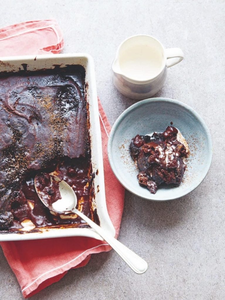Bake the unpromising mixture at 160°C/fan 140°C/gas 3 for about 35 minutes, until the pudding is firm in places, and gently bubbling. Leave for 5 minutes, dust lightly with cocoa powder, if liked, then serve with cream, because why not?
